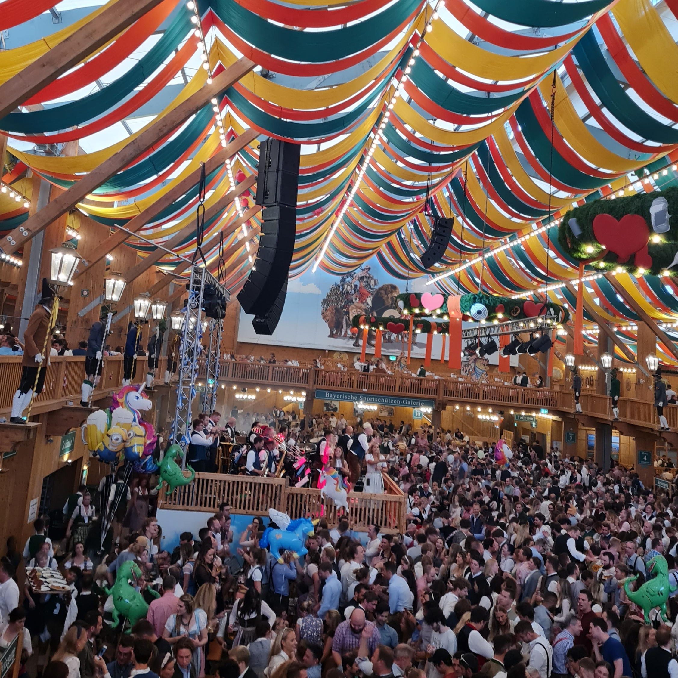 Dressed in traditional Bavarian dirndl and lederhosen, we sat in a booth on the terrace level of the beautiful Schützen-Festzelt tent - though 'tent' is very misleading, it's immense! - looking out over the thousands of people dancing, singing, and drinking. The food was plentiful and delicious, and the atmosphere was like nothing else I've ever experienced.
